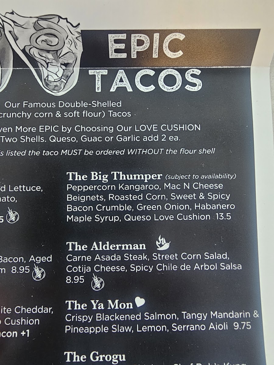Herbed Chicken, Sweet & Spicy Bacon, Aged White Cheddar, Salsa, Sour Cream (GF) *If Gluten Free (GF) is listed with the EPIC Taco, it MUST be ordered WITHOUT the Flour Shell